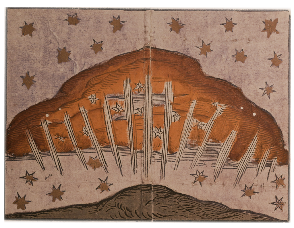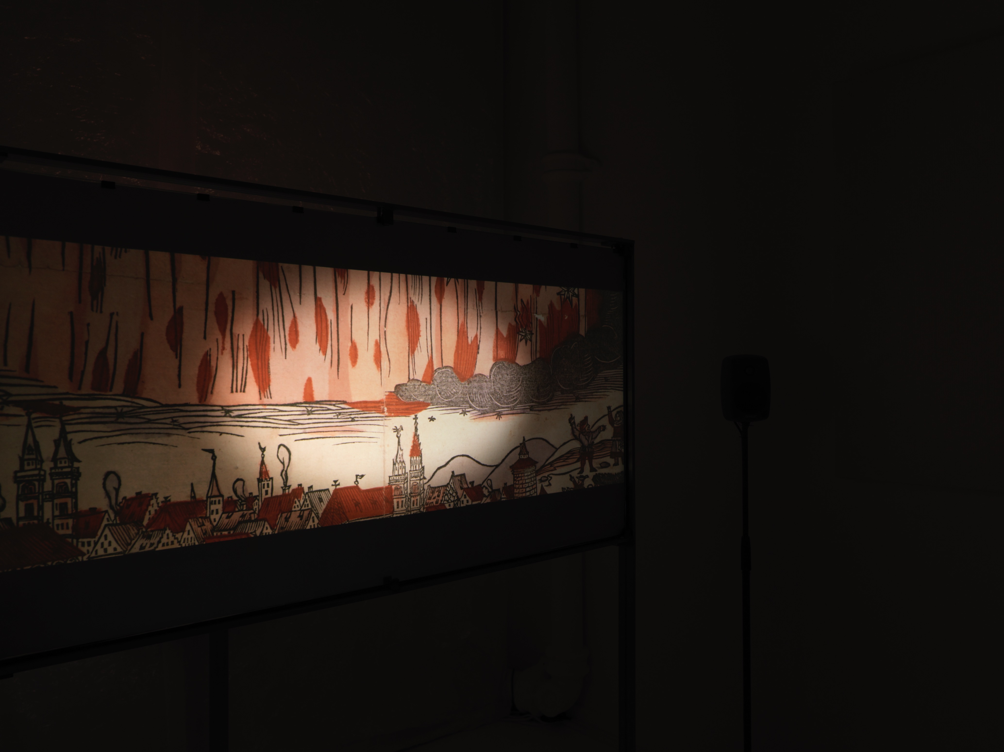 “On the morning of December 28, 1560, people in Germany and Switzerland woke to the unexpected appearance of ‘sky fires’. Drastic weather changes and the onset of the Little Ice Age had drawn the Northern Lights far south into the Alps making the deeply religious population see dragons and devil figures flying through the burning night sky. Their apocalyoptic visions once captured in handcolored wood block prints set the scene for this extraordinary 22mins video and sound installation.